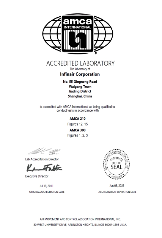 -- 英飛空氣動力實驗室擴建2號風室,風量風壓覆蓋范圍更大,并獲AMCA頒發認可證書,成為AMCA認可實驗室;