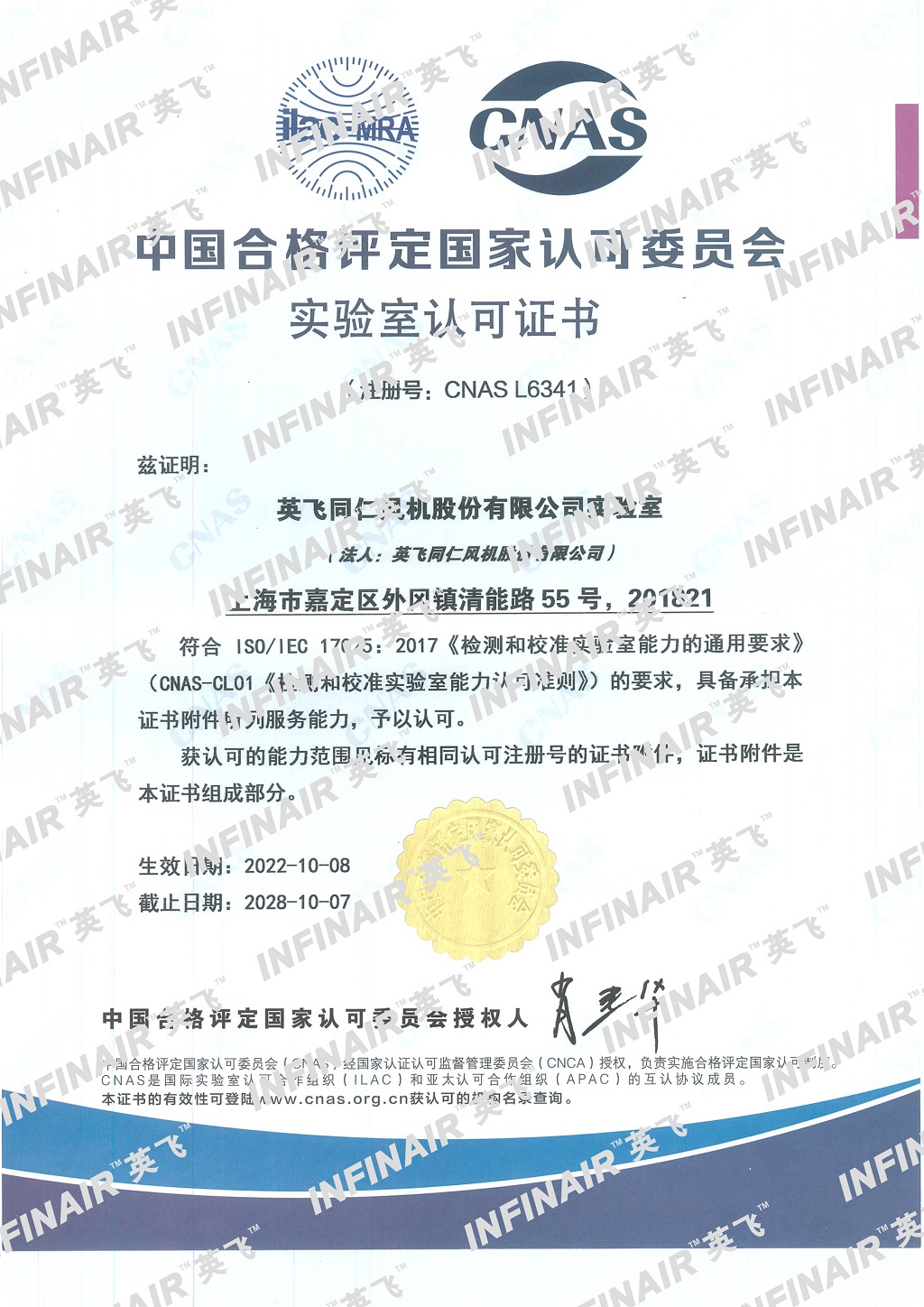 -- 英飛實驗室通過了根據國際標準ISO17025(《檢測和校準實驗室能力的通用要求》)的“中國合格評定國家認可委員會( CNAS )檢測實驗室認可證書” 的復審認可證書;